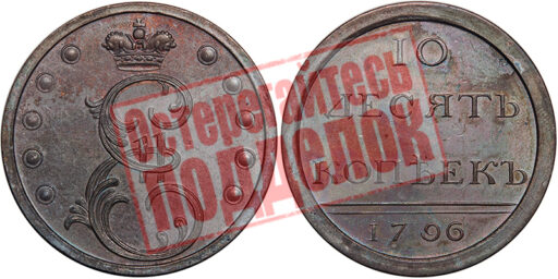 Пробные 10 копеек 1796 года, чеканка в кольце «разукрашенный вензель»