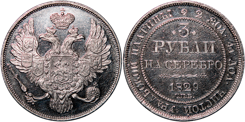 ЦИКЦ провел экспертизу 3 рублей 1829 года, Санкт-Петербургского монетного двора. Монета специального чекана, в улучшенном исполнении (зеркальные поля, матированный рельеф). Следует отметить, что платиновые трёхрублёвики в улучшенном исполнении встречаются весьма редко.