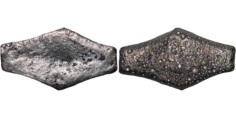 ЦИКЦ провел экспертизу серебряного платежного слитка шестиугольной формы – гривна киевского типа (рис. 1, 2). Поверхность шероховатая. На верхней, относительно более ровной поверхности слитка присутствует неглубокий усадочный желобок. На нижней, слегка выпуклой поверхности имеются многочисленные мелкие каверны. Платежные слитки киевского типа изготавливались и находились в обращении на территории Южной Руси в XII – первой половине XIII века….
