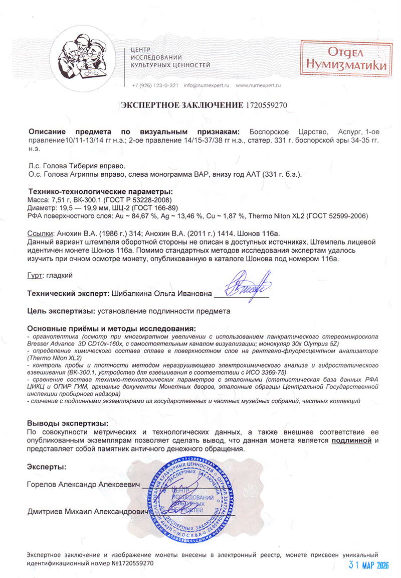 ЦИКЦ провел экспертизу античной монеты — Боспорское Царство, Аспург, 1-ое правление 10/11-13/14 гг н.э.; 2-ое правление 14/15-37/38 гг н.э., статер. 331 г. боспорской эры 34-35 гг. н.э.