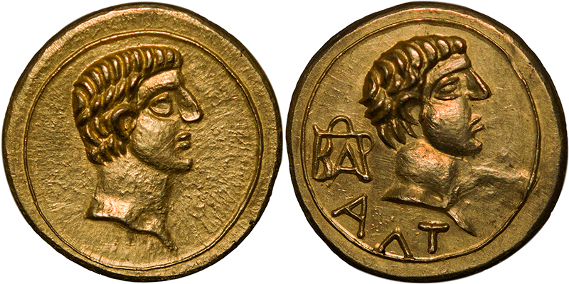 На лицевой стороне – голова Агриппы вправо, слева монограмма ΒΑΡ, внизу год ΑΛΤ (331 г. б.э.).