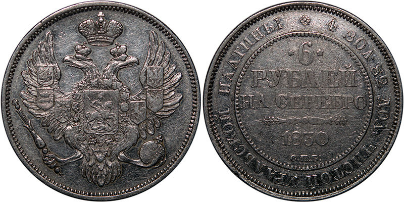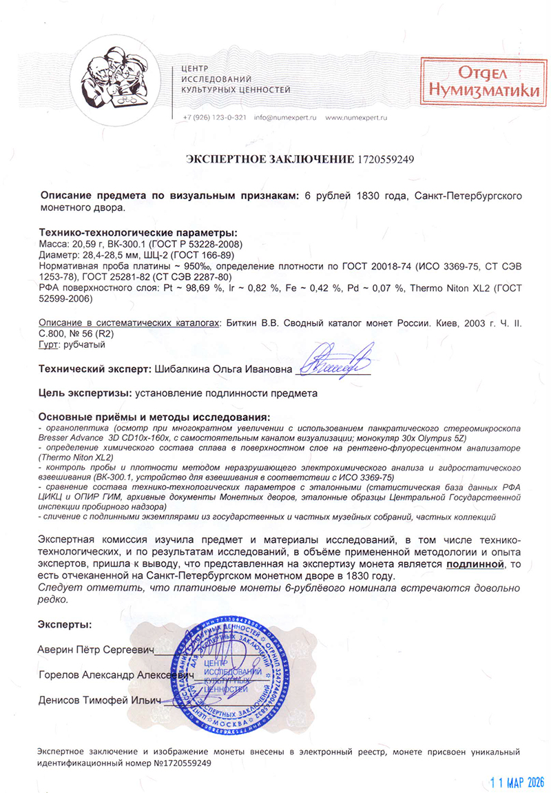ЦИКЦ провел экспертизу 6 рублей 1830 года, Санкт-Петербургского монетного двора.