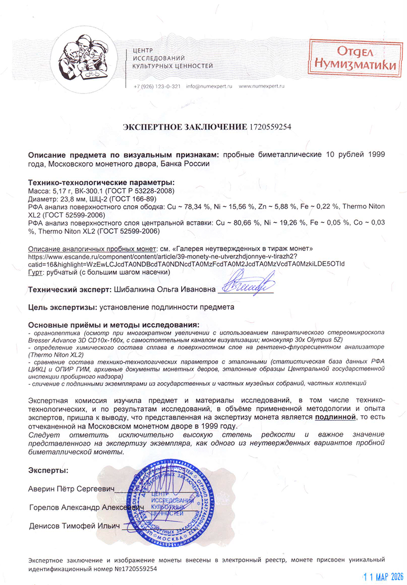 Экспертиза пробных биметаллических 10 рублей 1999 года