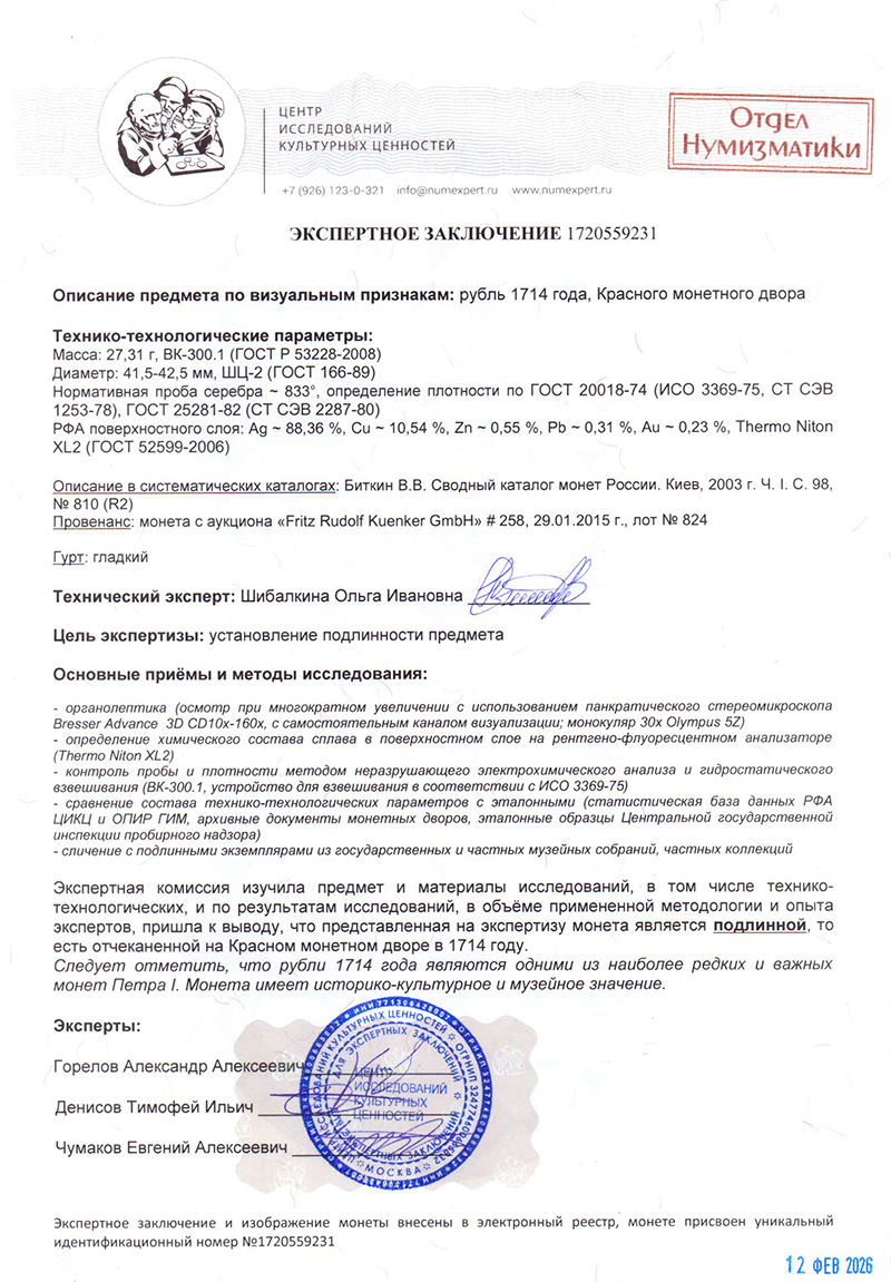 ЦИКЦ провел экспертизу рубля 1714 года, Красного монетного двора