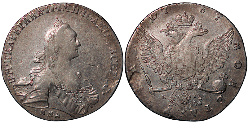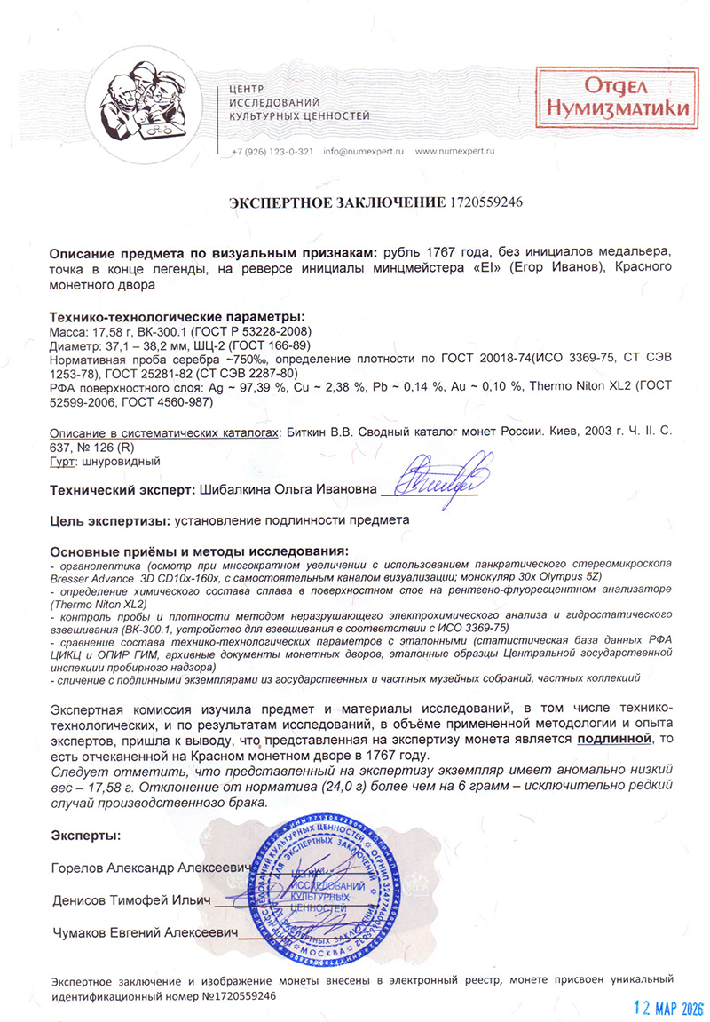 ЦИКЦ провел экспертизу рубль 1767 года, без инициалов медальера, точка в конце легенды, на реверсе инициалы минцмейстера «EI» (Егор Иванов), Красного монетного двора