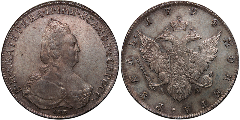 рубль 1794 года, в обрезе рукава знак гравера «TI» (Т. Иванов), на реверсе инициалы минцмейстера «АК» (Андрей Коцберг) Санкт-Петербургского монетного двора