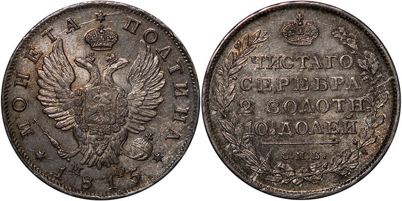 полтина 1815 года, с инициалами минцмейстера «МФ» (Михаил Федоров) под орлом, Санкт-Петербургского монетного двора