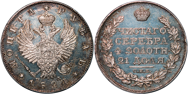 рубль 1824 года, с инициалами минцмейстера ПД (Павел Данилов) под орлом, Санкт-Петербургского монетного двора