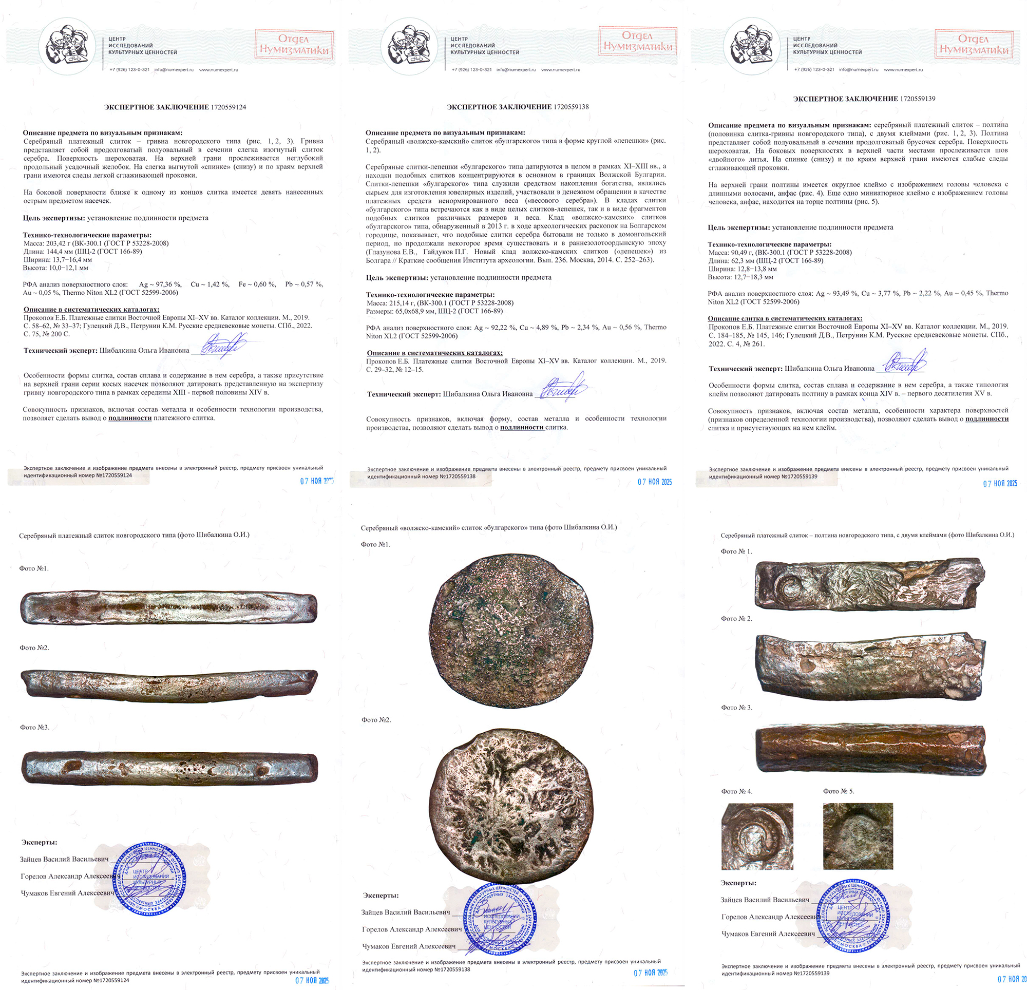 серебряный платежный слиток – полтина (половинка слитка-гривны новгородского типа), с двумя клеймами. Полтина представляет собой полуовальный в сечении продолговатый брусочек серебра. Поверхность шероховатая. На боковых поверхностях в верхней части местами прослеживается шов «двойного» литья. На спинке (снизу) и по краям верхней грани имеются слабые следы сглаживающей проковки.