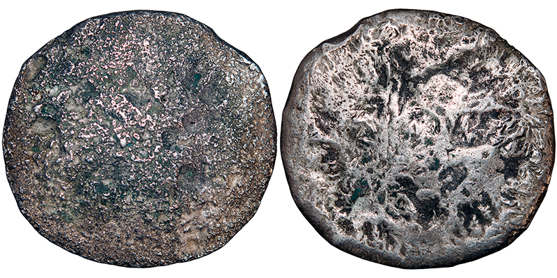 На верхней грани полтины имеется округлое клеймо с изображением головы человека с длинными волосами, анфас.