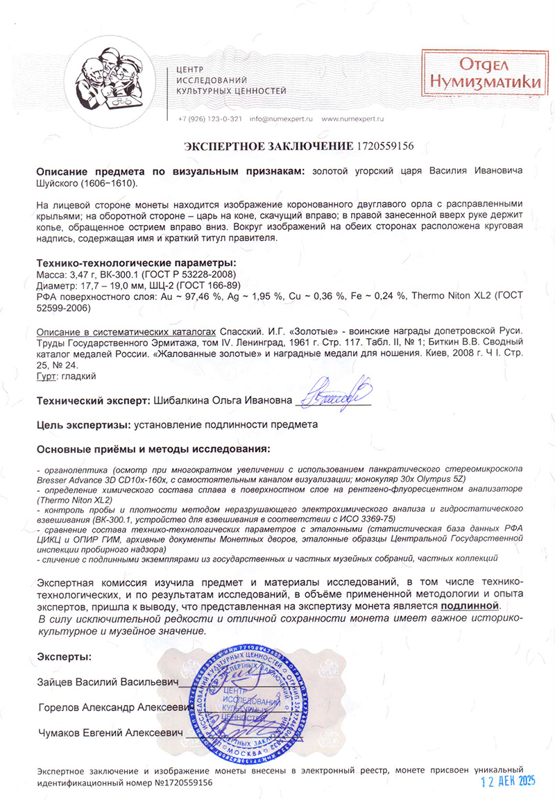 ЦИКЦ провел экспертизу золотого угорского царя Василия Ивановича Шуйского (1606−1610).