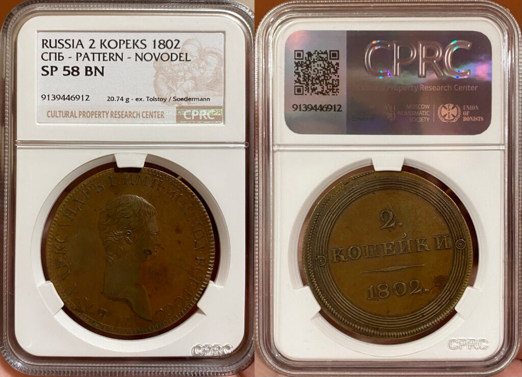 ЦИКЦ провел грейдинг и слабирование новодела пробных 2 копеек 1802 года с портретом Александра I