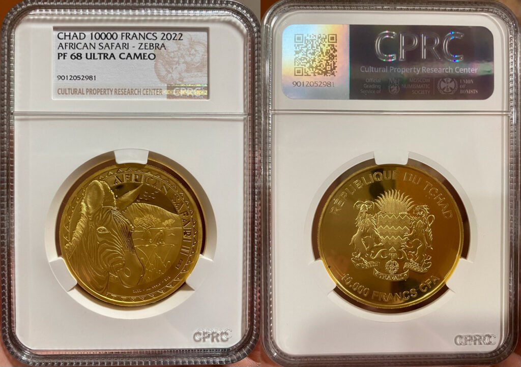 Грейдинг и слабирование золотых монет республики Чад с изображением африканской фауны