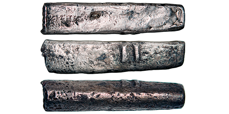 ЦИКЦ провел экспертизу слитков: серебряный платежный слиток – литовский (западнорусский) изрой. Слиток имеет форму продолговатой палочки со скругленными концами. Поверхность шероховатая, местами пористая. На слегка выпуклой «спинке» слитка, в его центральной части, имеются две глубокие косые насечки. Согласно одной из версий, подобные глубокие и широкие насечки наносились для демонстрации доброкачественности сплава драгоценного металла во внутренней…