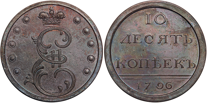 Пробные 10 копеек 1796 года, чеканка в кольце «разукрашенный вензель»