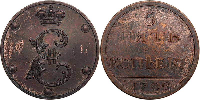 Пробные 5 копеек 1796 года, чеканка в кольце «разукрашенный вензель»