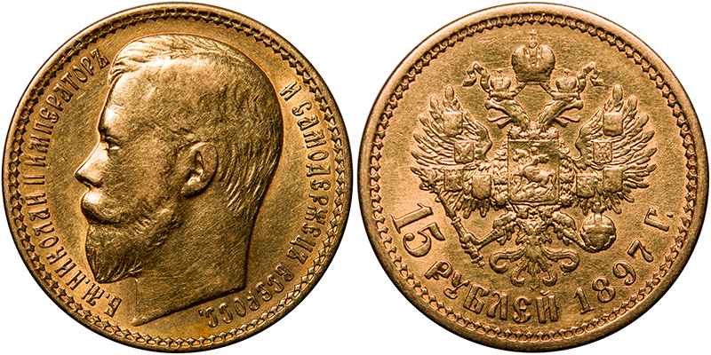 15 рублей 1897 года, 3 буквы заходят за обрез шеи