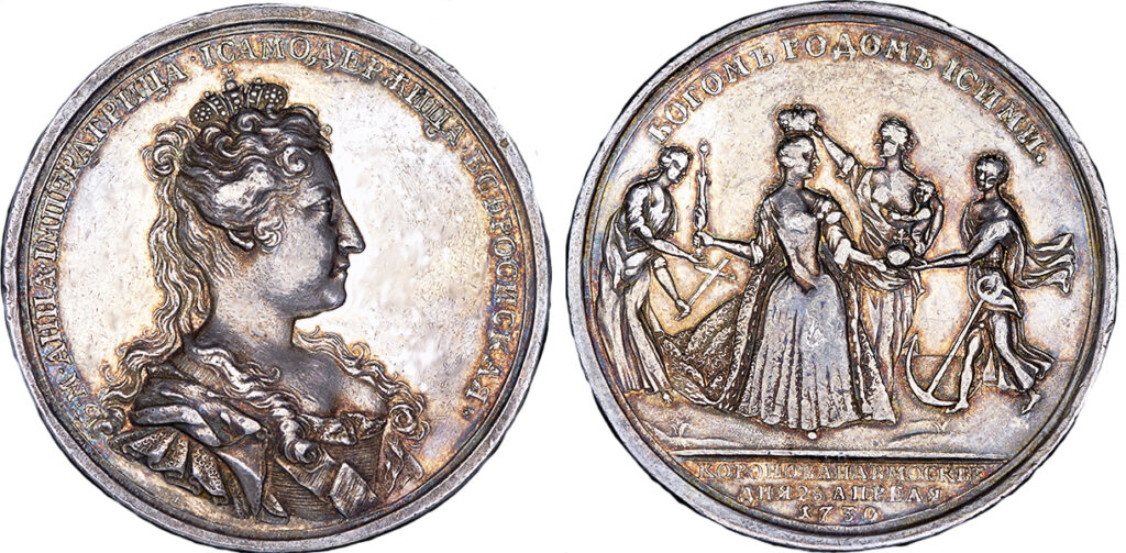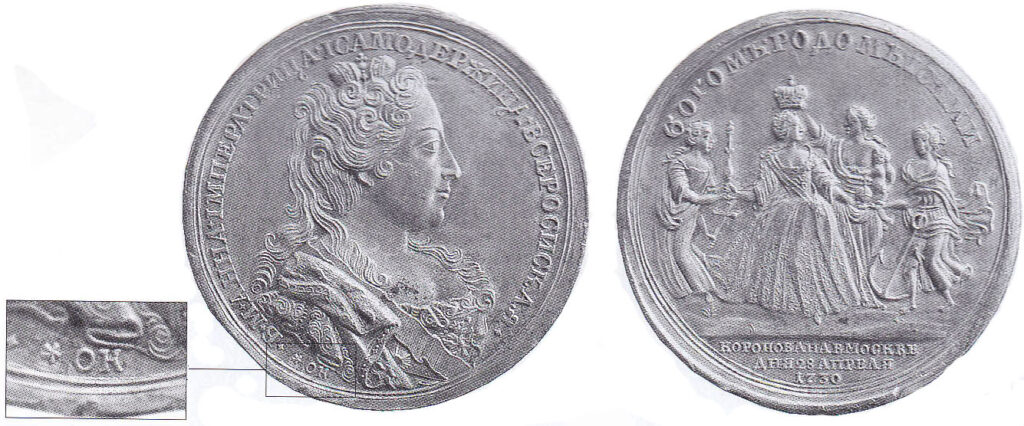 На коронационных медалях Анны Иоанновны, датированных 1730 годом можно обнаружить подписи Бенжамена Скотта, Самойлы Юдина и Тимофея Иванова. Однако работы указанных уважаемых медальеров носят ретроспективный характер. Скотт поступил на службу в Петербургском Монетном дворе в 1748 году.
