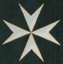 Очевидно, что на переднем плане изображен щит. В том, что это щит, а не элемент декора, можно убедиться, если переместить взгляд на рис. 9, на котором представлено оружие рыцарей-госпитальеров. Наконец приведем описание герба Мальтийского ордена: “Герб Ордена представляет собой щит, в червлёном поле которого серебряный крест. Позади щита — мальтийский крест того же металла, щит окружён цепью великого магистра и обрамлён орденскими знамёнами. Чёрная, украшенная золотом и подбитая горностаем мантия увенчана короной великого магистра” (рис. 10).
