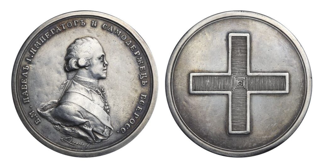 Медальеру удалось смикшировать неказистые черты лица правителя и придать портрету требуемую презентабельность. Штемпель лицевой стороны оказался настолько удачным, что был впоследствии использован для чеканки новодельного рубля. Непосвященному в лабиринты нумизматики, трудно догадаться в память какого события медаль была выбита. Вместо ожидаемой декларативной надписи, объясняющей причину выпуска миниатюры, на оборотной стороне изображен равносторонний крест, состоящий из двух одинаковых прямоугольных перекладин, пересекающихся под прямым углом, известный под названием “греческий”.