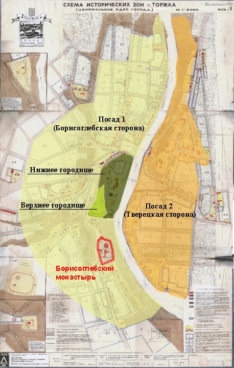 Участок работ располагался в 60 м западнее Дмитриевской церкви, взорванной в 1932–1933 гг. В XVII в. территория исследований входила в так называемый Дмитриевский конец Торжка.