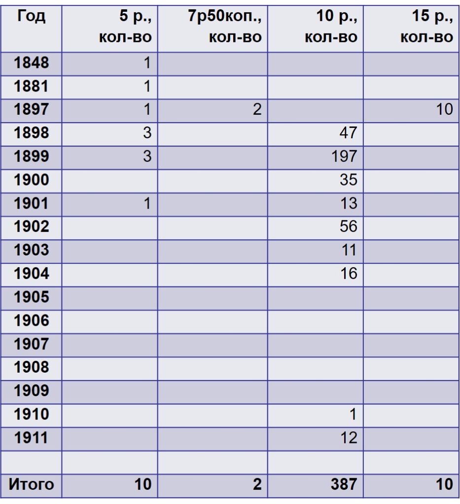 В кладе 409 золотых монет с 1848 г. по 1911 г., из них 10 шт. номиналом 5 рублей, 2 шт. – 7,5 рублей, 387 шт. – 10 рублей, 10 шт. – 15 рублей. Распределение монет по годам чеканки представлено в таблице.