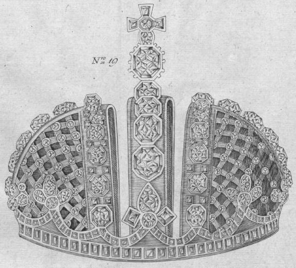 «Обѣ половины этой короны имѣютъ округленную форму съ рѣшетчатымъ узоромъ; на пересѣченіяхъ узора находятся трилистники, составленные изъ брилліантовъ. На внутреннихъ каймахъ обѣихъ половинокъ, обращенныхъ къ дугѣ, видны отборные жемчуги, помѣщенные между двумя рядами алмазовъ. На дугѣ, большой рубинъ (лалъ), снятый съ короны Екатерины I и Петра II. Нижній ободокъ короны украшенъ алмазами и самоцвѣтными камнями высокаго достоинства.