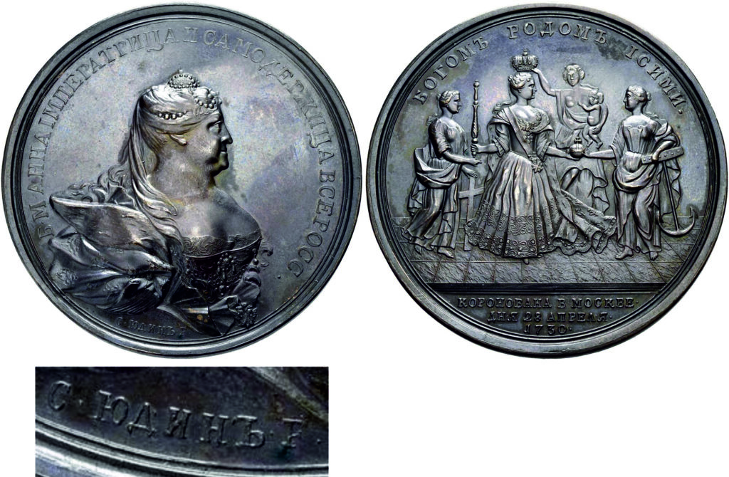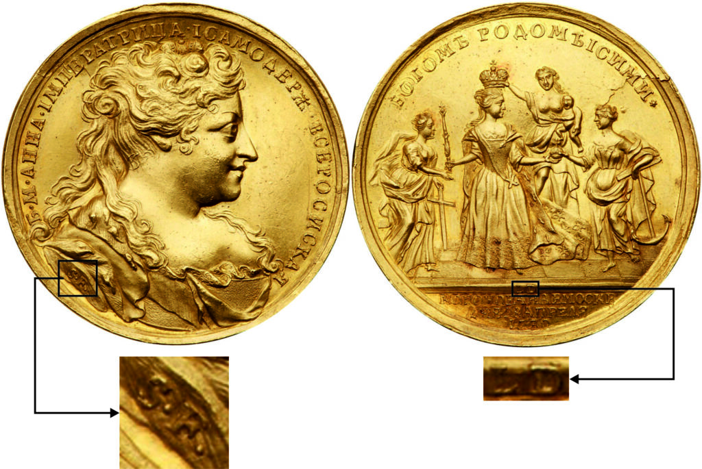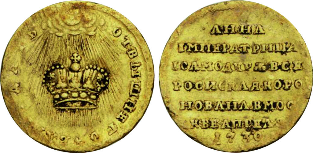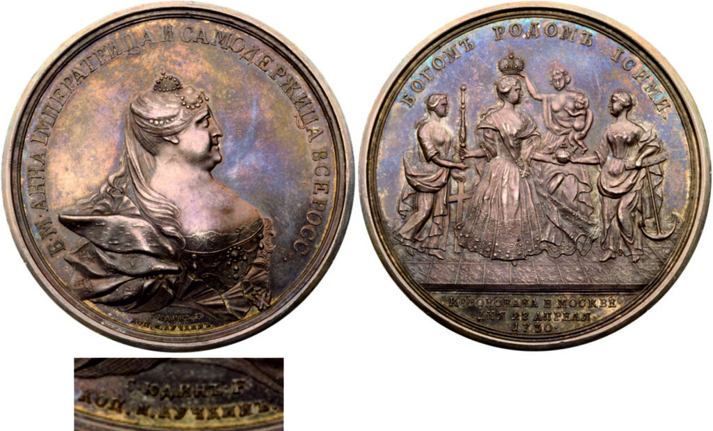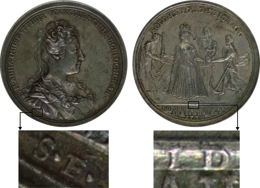 «В собрании Музеев Московского Кремля представлены два оригинала коронационной медали Анны Иоанновны малого размера (диаметром в 43 миллиметра) из серебра, исполненные медальерами Московского монетного двора, без подписи. Скорее всего, они выполнены А. Шульцем или Г.Ф. Рейбишем». [15]