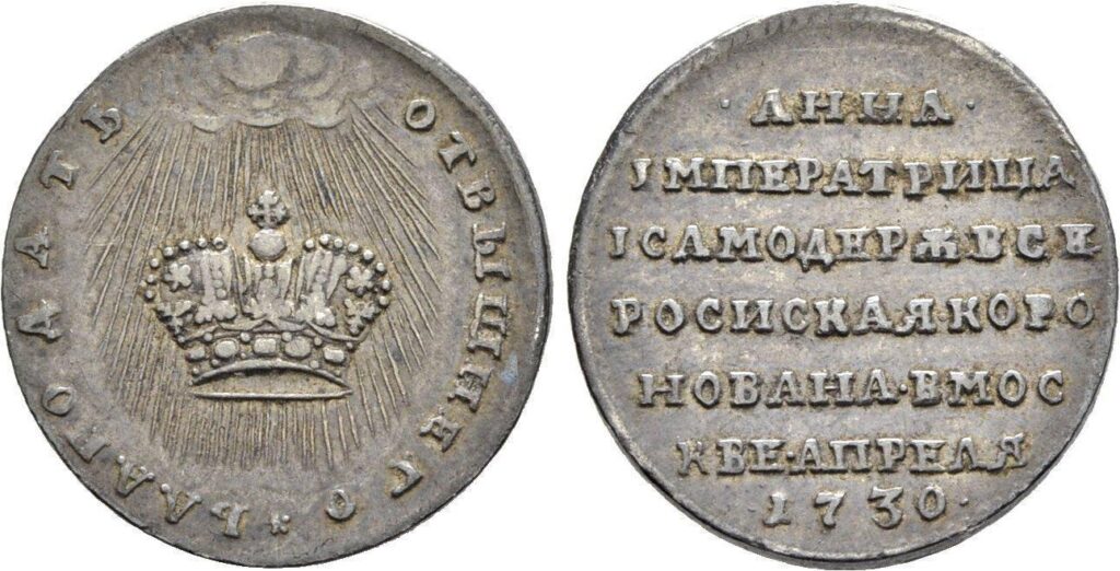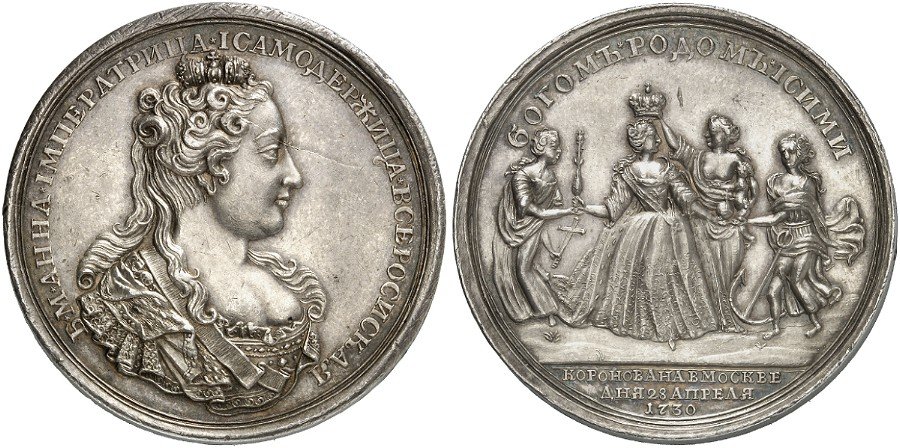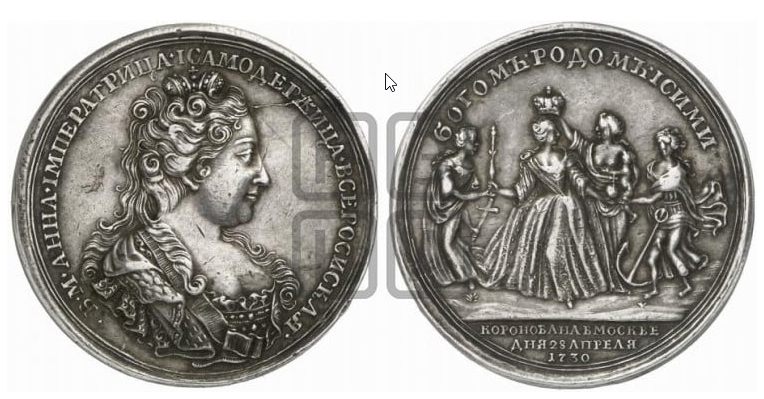 Реверс: БОГОМЪ РОДОМЪ IСИМИ • Императрица представлена в коронационном платье и горностаевой мантии, в окружении трех женских фигур, олицетворяющих Веру, Надежду, Любовь. Вера, изображенная с крестом в руке, вручает императрице скипетр; Надежда, с якорем — державу; Любовь, с младенцем на руках, возлагает на Анну Иоанновну корону. Под линией обреза в центре инициалы гравера L . D . (Л. Дмитриев). Под обрезом: КОРОНОВАНА ВМОСКВЕ / ДНЯ 28 АПРЕЛЯ | 1730