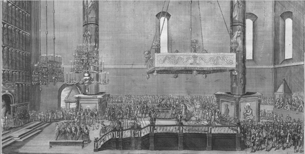 Два герольдмейстера предшествовали регалиям, затем, исполнив свой долг, заняли места по обе стороны от первых ступеней трона. Генералитет и другие знатные особы, участвовавшие в процессии, разместились на отведённых им местах в галереях, где и оставались на протяжении всей церемонии коронации.