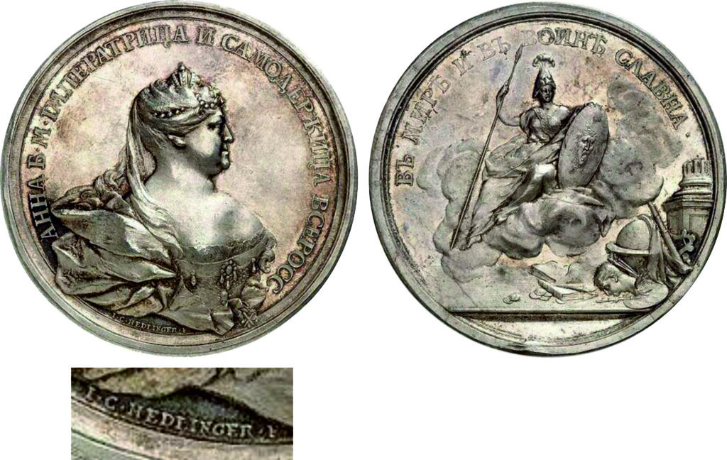 И.К. Гедлингеру (1691 — 1771) предложили должность главного медальера России с неограниченными условиями. В середине октября 1735 года он прибыл в Петербург. Хотя его пребывание в России длилось около двух лет, Гедлингер создавал медали с «русскими» сюжетами и до, и после этого периода. Его подпись можно увидеть на медалях, посвященных Н.Ф. Головину (1731), Анне Иоанновне (1736), заключению мира с Турцией (1739) и А.И. Остерману (1738). Подписи варьируются: «I. С. HEDLINGER. F.», «HEDLINGER F», «I. С. H. F» и «I. С. Н.».  Им же были вырезаны штемпеля для рублевика 1736 г. и большая государственная печать.