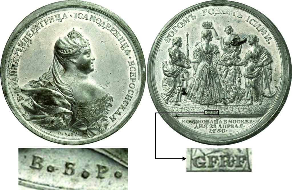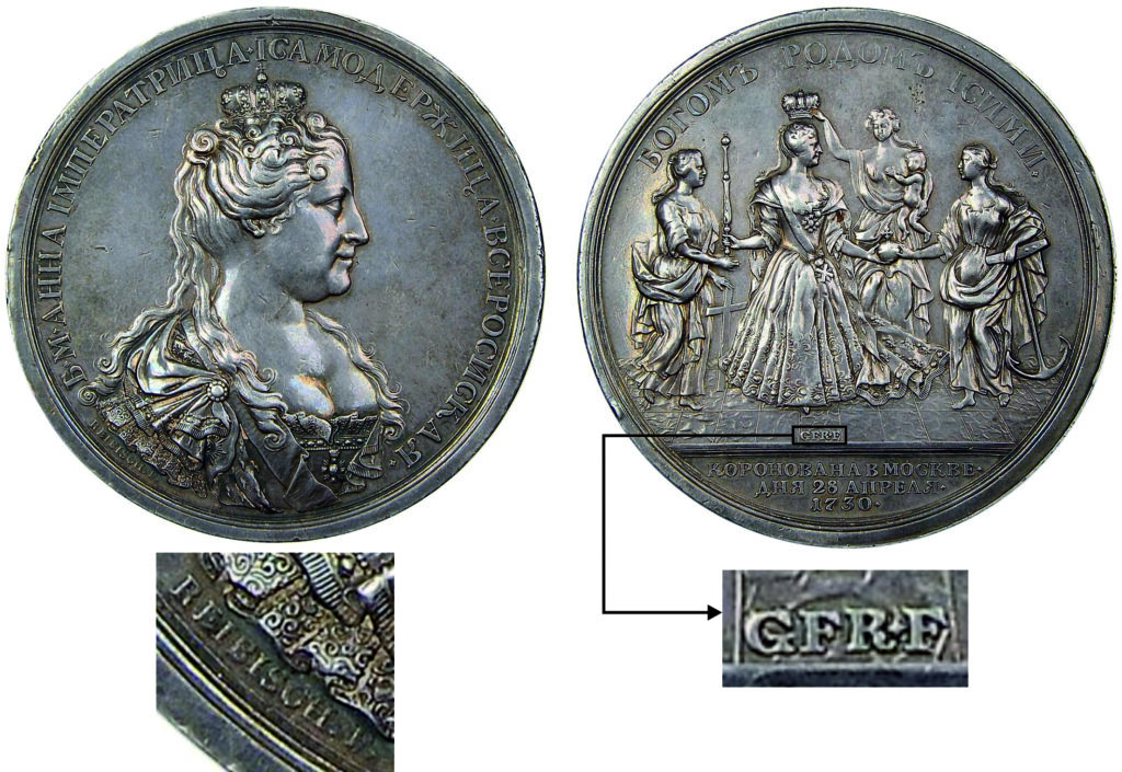 Под сюжетом коронации инициалы медальера G F R • F (Г.Ф. Рейбиш исполнил)