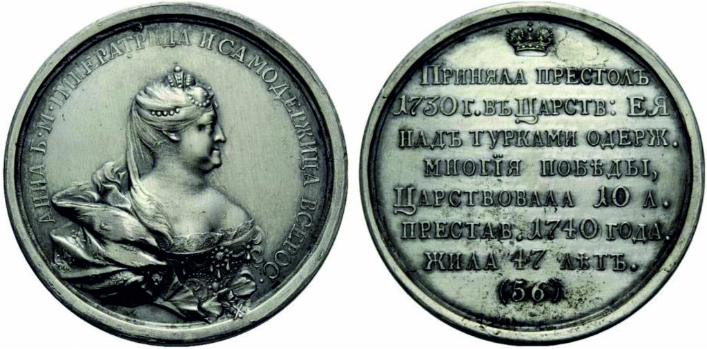 Реверс: Под Императорской короной параллельными строками восьмистрочная надпись. ПРИНЯЛА ПРЕСТОЛЪ | 1730 Г. ВЪ ЦАРСТВ: ЕЯ | НАДЪ ТУРКАМИ ОДЕРЖ. | МНОГÏЯ ПОБѢДЫ, | ЦАРСТВОВАЛА 10 Л. | ПРЕСТАВ. 1740 ГОДА. | ЖИЛА 47 ЛѢТЪ . | (56)