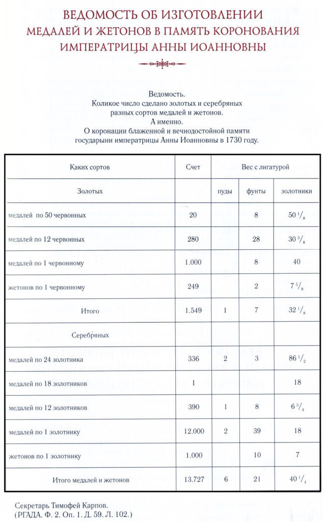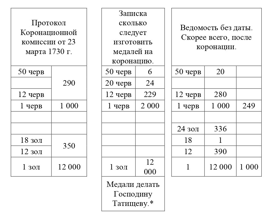 В архивных документах видно разногласие в количестве изготовленных золотых и серебряных медалей и жетонов.