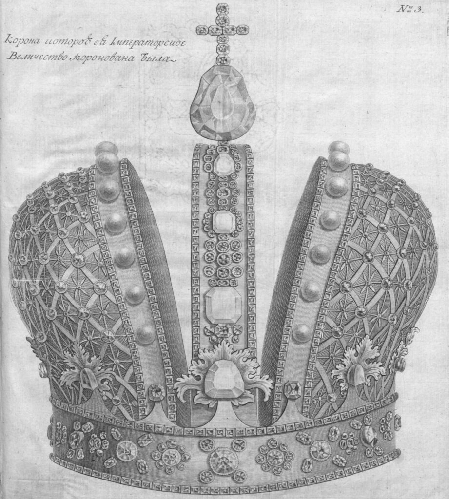 Потом помянутый же Архиерей, наложил на Главу Ея Величества Императорскую Корону, глаголя: «Во имя Отца, и Сына, и Святаго Духа. Аминь». Предав и сии глаголы: