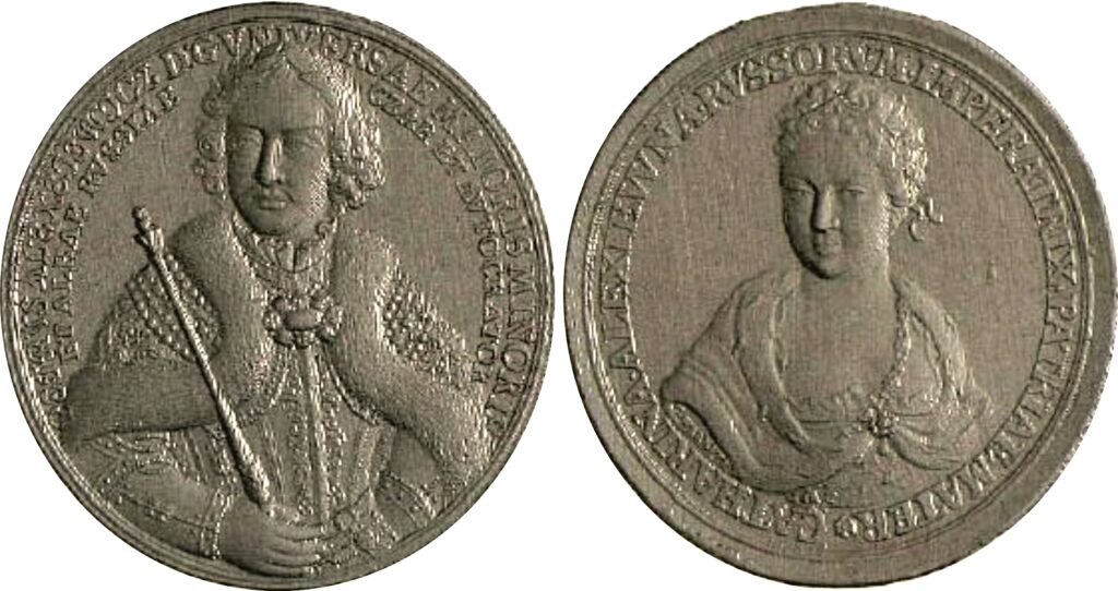 В исторической серии, медалей-персоналий, Император Петр I и Императрица Екатерина I увековечены под номерами 53 и 54.