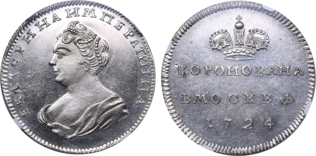Реверс: Под императорской короной прямая трехстрочная надпись. КОРОНОВАНА | ВМОСКВѢ | 1724