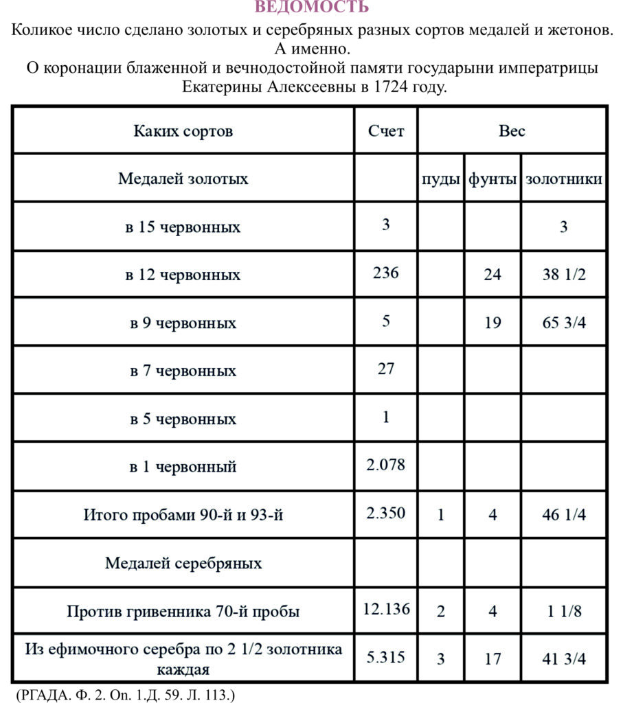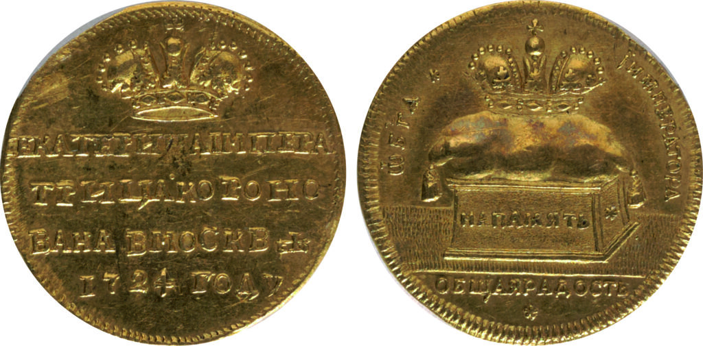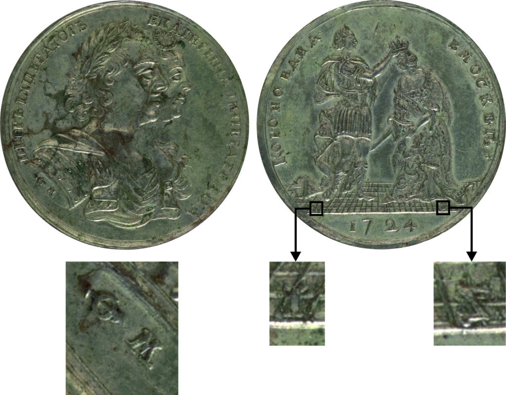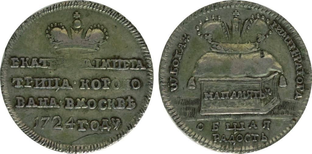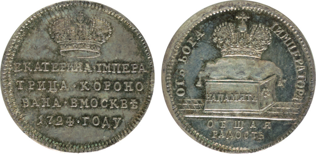 А: Под императорской короной прямая четырехстрочная надпись: ЕКАТЕРИНА IМПЕРА | ТРИЦА • КОРОНО | ВАНА • ВМОСКВѢ | 1724 ГОДУ.