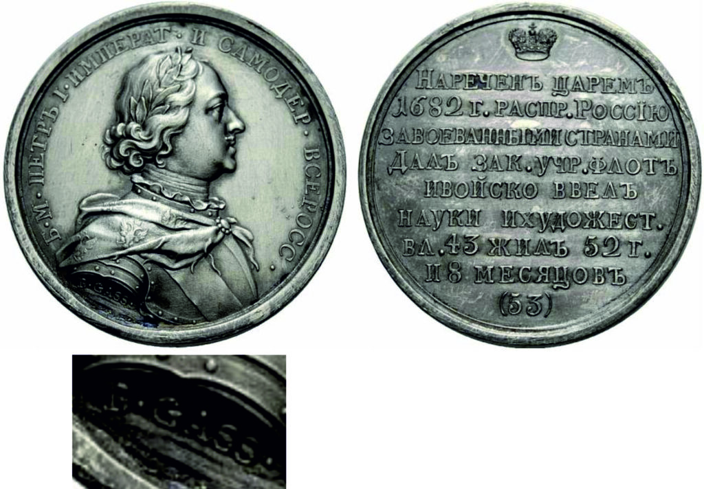 Аверс: Б • М • ПЕТРЪ I • ИМПЕРАТ • И САМОДЕР • ВСЕРОСС • Погрудный портрет Петра I обращенного вправо, увенчанного лавровым венком и облаченного в доспехи, покрытые мантией из меха, в обрезе плеча подпись В • GASS •