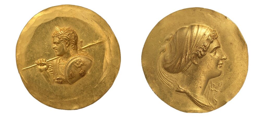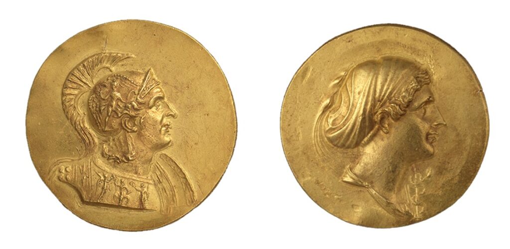 Слева — аверс медальона с портретом Каракаллы в доспехах с копьем и щитом. 69,42 г. Справа — аверс медальона с неизвестной женщиной, возможно, это собирательный женский образ или Олимпия — мать А. Македонского. 48.89 г.