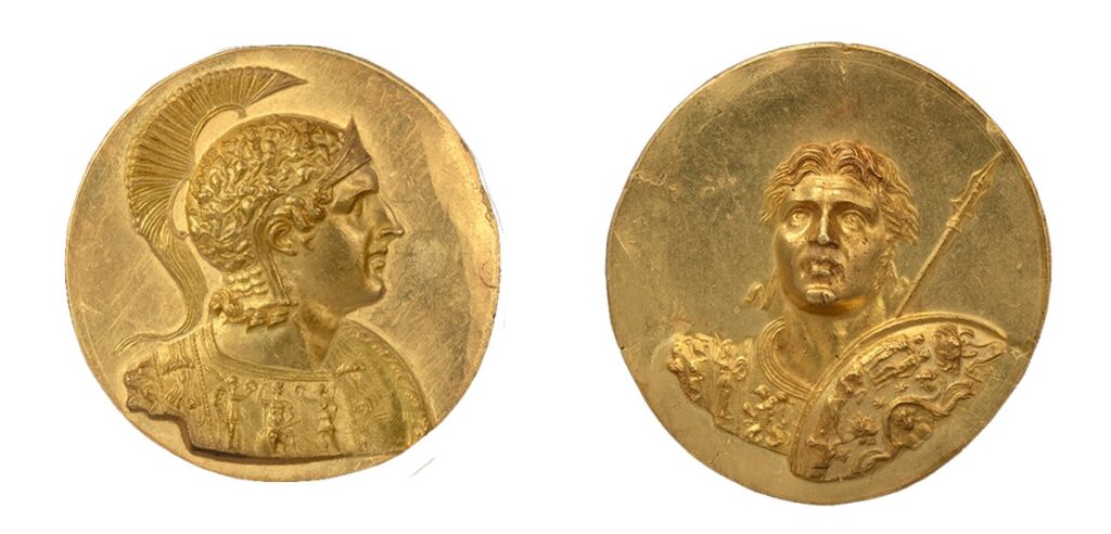 Слева — аверс медальона с портретом А. Македонского в доспехах и аттическим шлемом. 77.47 г. Справа — аверс медальона с изображением Александра Македонского с диадемой, в латах и частью круглого щита. 70,68 г.