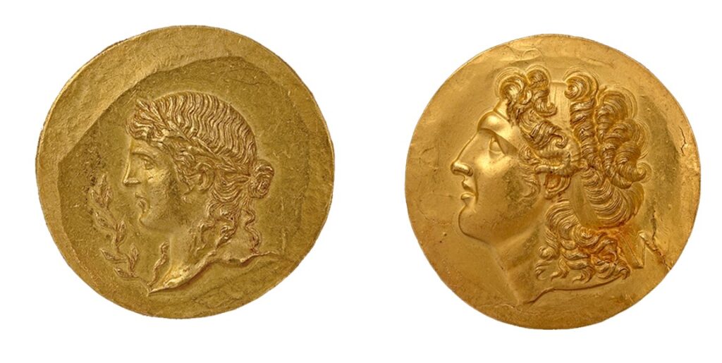 Слева — аверс медальона с изображением портрета Аполлона, сына Зевса и богини Лето. 47,61 г. Справа — аверс медальона с изображением портрета А. Македонского с бычьим рогом. 112,66 г.