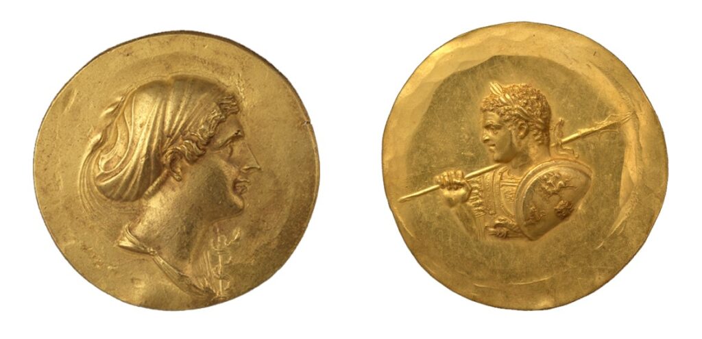 Слева — аверс медальона с неизвестной женщиной, возможно, это собирательный женский образ или Олимпия — мать А. Македонского. 48.89 г. Справа — аверс медальона с портретом Каракаллы в доспехах с копьем и щитом. 69,42 г.