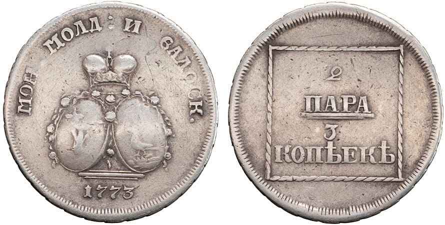 В 1788 году , когда проводилась всеобщая перечеканка старой легковесной меди, было решено перечеканить изъятую молдавскую контрабанду в обычные русские монеты достоинством в 16 рублей за пуд. Молдавские монеты послужили весьма удобными заготовками: пара в 1 1/2 копейки составляла одну приемлемую копейку, а экземпляры в 2 пары стали двухкопеечным грошем. Двухпаровых монет было гораздо больше, чем монет в одну пару. Из обеих разновидностей было произведено российских медных монет на сумму в 1300 рублей, что составило всего около 100.000 монет. Это кажется значительным количеством, но в сравнении с производством других монет это было каплей в море, и эти конкретные перечеканки довольно редки.