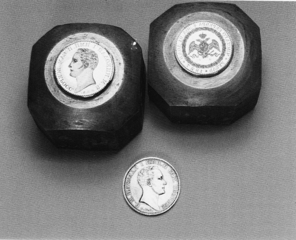 Любопытно, что великий князь называет новоделы монетами пробными, хотя изготовление подлинных тестовых экземпляров было приостановлено на этапе создания штемпелей и получения оттиска лицевой стороны на поверхности мягкого металла (свинца) (рис. 14).