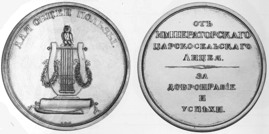 Числясь медальером, Рейхель не проявил себя усердным мастером. Его непосредственный начальник К. Леберехт даже ходатайствовал перед руководством Министрства финансов об его увольнении. В.А. Калинин констатитует, что творческий потенциал Рейхеля “в полной мере так и не раскрылся за годы его работы в Медальерной палате”. Уважаемый автор свидетельствует, что существуют около десяти подписных работ Рейхеля. В их числе копии штемпелей медалей и две медали-премии для воспитанников лицеев (рис. 17). Последний рисунок в качестве образца медальерного искусства Рейхеля приводит и Е.С. Щукина [15]. Даже не профессионалу понятно, что резать на металлической плоскости геометрические фигуры легче, чем со всей ответственностью создавать рельефное изображение монарха, добиваясь портретного сходства. Правда подпись Рейхеля можно увидеть на аверсе двух ретроспективных портретных медалей, но данные работы не являются оригинальными, а представляют из себя копии известных мастеров. [16].