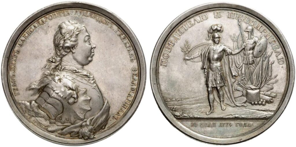 «В указе о наградах победителю «при мире» 1774 г. фельдмаршалу Румянцеву наряду с денежной суммой, жезлом, осыпанном драгоценностями, был оговорен выпуск в его честь медали». [6]