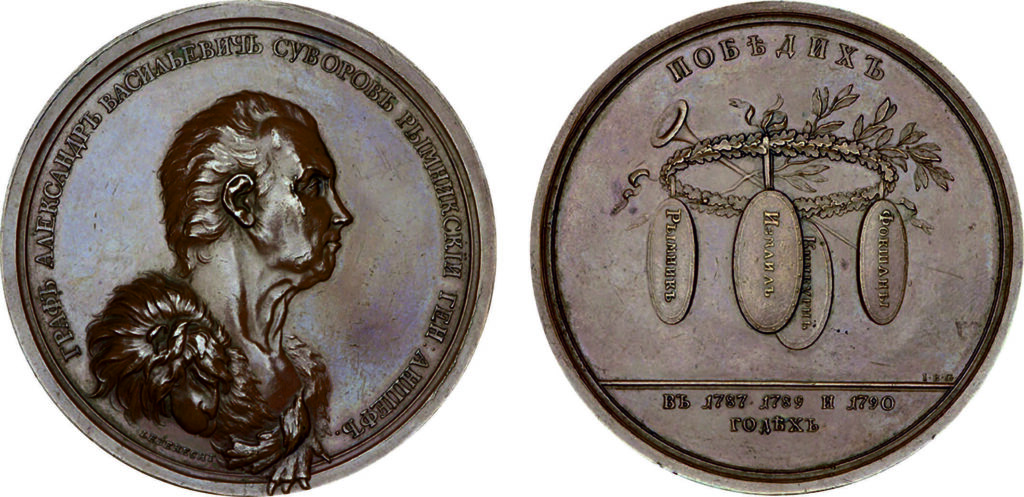 Аверс: ГРАФЪ АЛЕКСАНДРЪ ВАСИЛЬЕВИЧЪ СУВОРОВЪ РЫМНИНСКÏЙ ГЕН : АНШЕФЪ. Бюст графа А. В. Суворова вправо, с львиной шкурой на плечах, внизу подпись LEBERECHT (Леберехт)