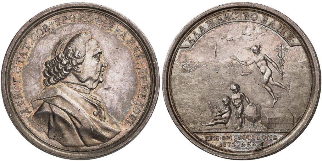 Аверс: ДѢЙСТ . CTAT . COB . ПРОКОФÏЙ . АКИН . ДЕМИДОВЪ . Бюст П. А. Демидова вправо, в парике, внизу инициалы Т • I (Т. Иванов*)
