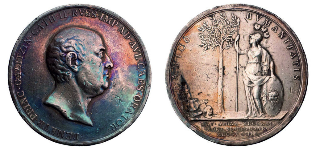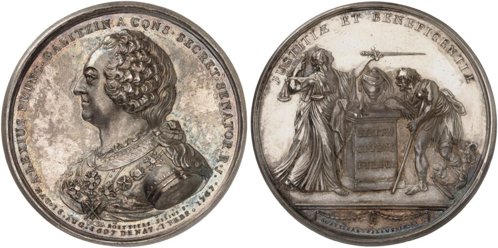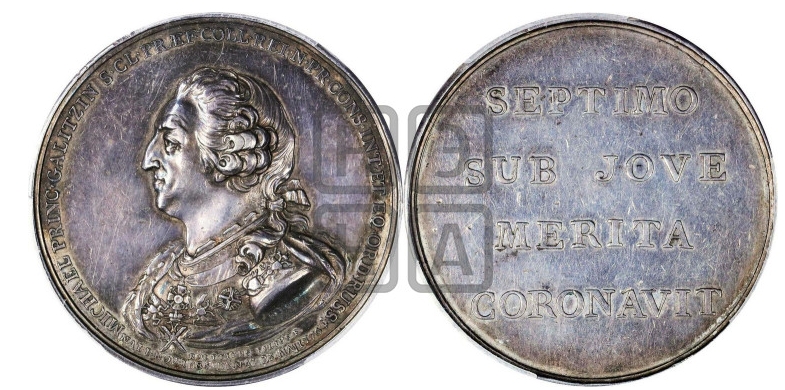Аверс: DEMETR • PRINC • GALITZIN • CATH • II • RVSS • IMP • AD • AVL • CAES • ORATOR • (Дмитрий, князь Голицын, посол Екатерины II, императрицы российской, при цесарском дворе). Портрет Д. Голицына вправо, в обрезе портрета подпись BALDENBACH (Бальденбах*)